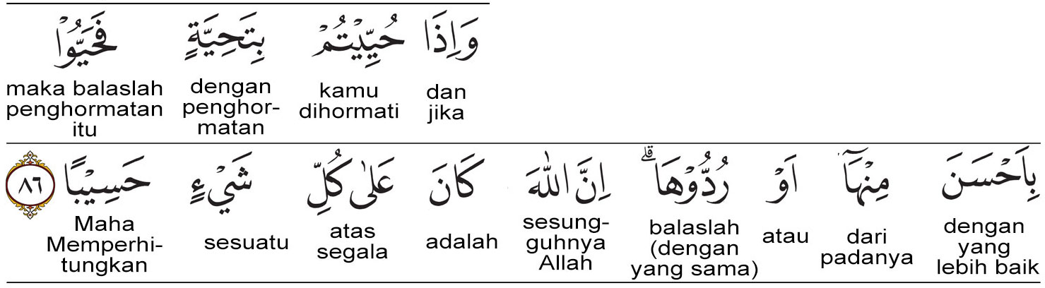 Kata bi-ahsana (بِأَحْسَنَ) artinya : dengan yang lebih baik. Kata minha (مِنْهَا) artinya : daripadanya. Mereka mengatakan bahwa bila orang yang memberi salam itu hanya mengucapkan assalamu ‘alaikum (السلام عليكم), maka jawabannya harus yang lebih baik, yaitu wa alaikumusslama wa rahmatullah (السلام عليكم و رحمة الله).