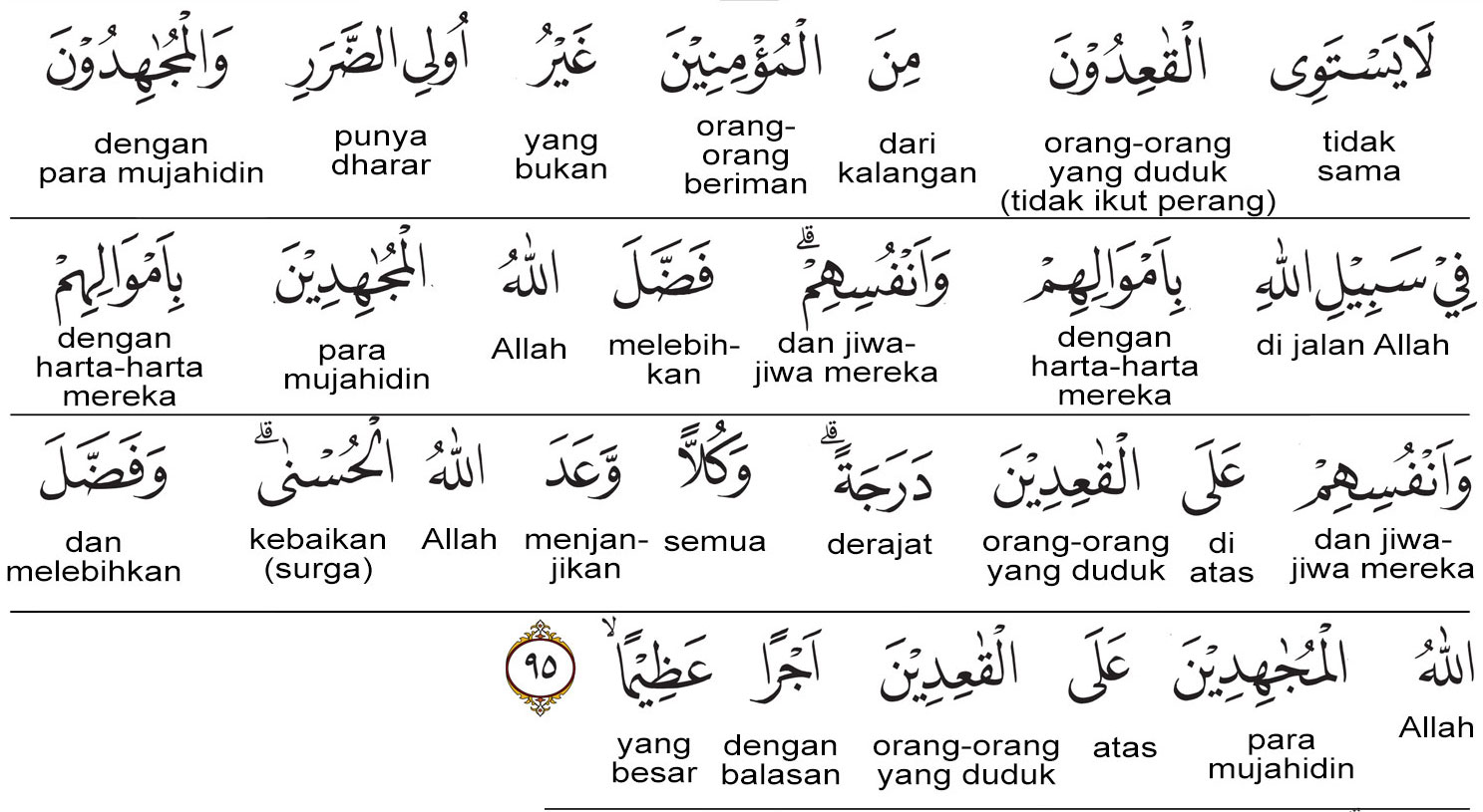 Kemenag RI 2019:Tidak sama orang-orang mukmin yang duduk (tidak turut berperang) tanpa mempunyai uzur dengan orang-orang yang berjihad di jalan Allah dengan harta dan jiwanya. Allah melebihkan derajat orang-orang yang berjihad dengan harta dan jiwanya atas orang-orang yang duduk (tidak ikut berperang tanpa uzur). Kepada masing-masing, Allah menjanjikan (pahala) yang terbaik (surga), (tetapi) Allah melebihkan orang-orang yang berjihad atas orang-orang yang duduk dengan pahala yang besar. Prof. Quraish Shihab:Tidaklah sama ant.tra orang-orang mukmin yang duduk (ridak turut berperang) selain vang memunyai uzur (alasan yang dibenarkan agama) dengan orang-orang (mukmin) yang bcrpndd di jalan Allali dengan ha n a dan jiwa mereka. Allah melebihkan orang-orang yang berjihad dengan harta dan jiwa mereka atas orang orang yang duduk, satu derajat. All.Ui menjanjikan ipalukt) yang lebih baik kepada masing-masing dan Allah melebihkan orang-orang yang berjihad atas orang yang duduk dengan pahala yang besar. Prof. HAMKA:Orang-orang yang duduk dari kalangan orang yang beriman yang tidak berhalangan, tidaklah sama dengan orang-orang yang berjihad pada jalan Allah dengan harta benda mereka dan diri-diri mereka. Allah telah melebihkan orang-orang yang berjihad dengan harta benda mereka dan diri mereka itu, daripada orang-orang yang duduk, satu derajat. Tetapi untuk tiap-tiap satu dari keduanya telah dijanjikan Allah kebaikan. Dan Allah telah melebihkan orang-orang Mujahidin daripada orang yang duduk, dengan ganjaran yang besar.