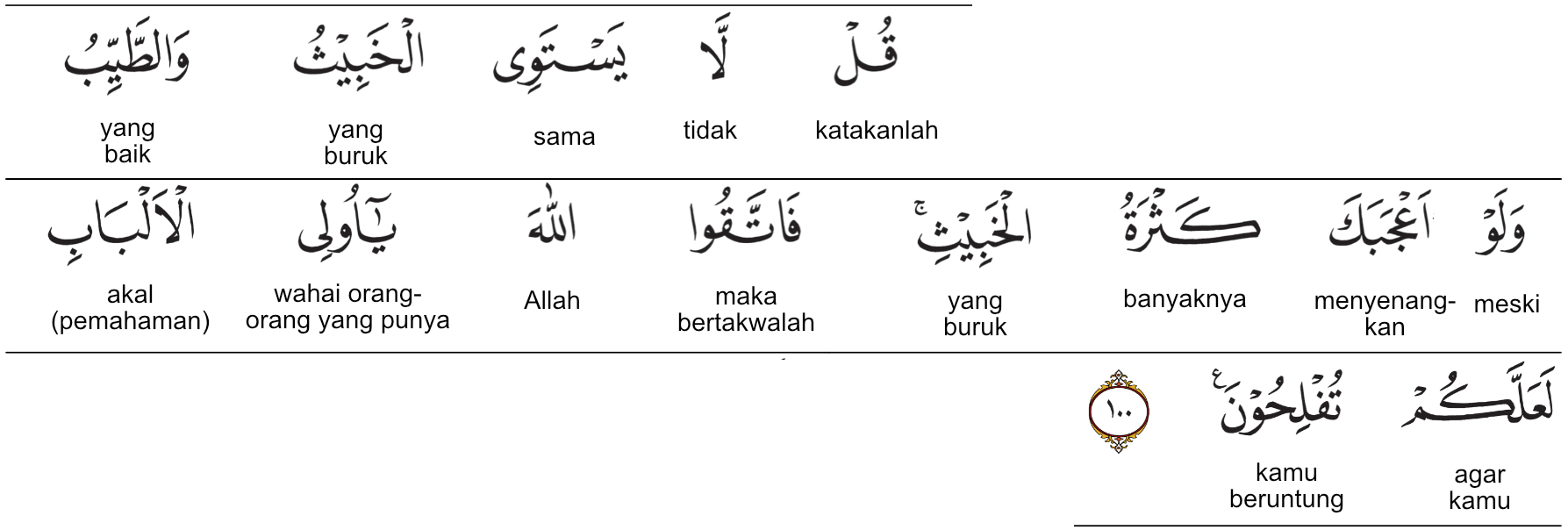 Kemenag RI 2019:Katakanlah (Nabi Muhammad), “Tidaklah sama yang buruk dengan yang baik meskipun banyaknya yang buruk itu menarik hatimu. Maka, bertakwalah kepada Allah wahai orang-orang yang berakal sehat agar kamu beruntung.” Prof. Quraish Shihab:Katakanlah (Nabi Muhammad saw.): “Tidak sama yang buruk dengan yang baik, meskipun banyaknya yang buruk itu menarik hatimu, maka bertakwalah kepada Allah, hai Ulul Alb?b (orang-orang yang berakal bersih, murni dan cerdas), supaya kamu mendapat keberuntungan.” Prof. HAMKA:Katakanlah: Tidaklah sama barang yang buruk dengan yang baik walaupun engkau tercengang oleh banyaknya yang buruk. Maka, takwalah kamu sekalian kepada Allah, wahai orang-orang yang mempunyai pikiran, supaya kamu beroleh kejayaan.