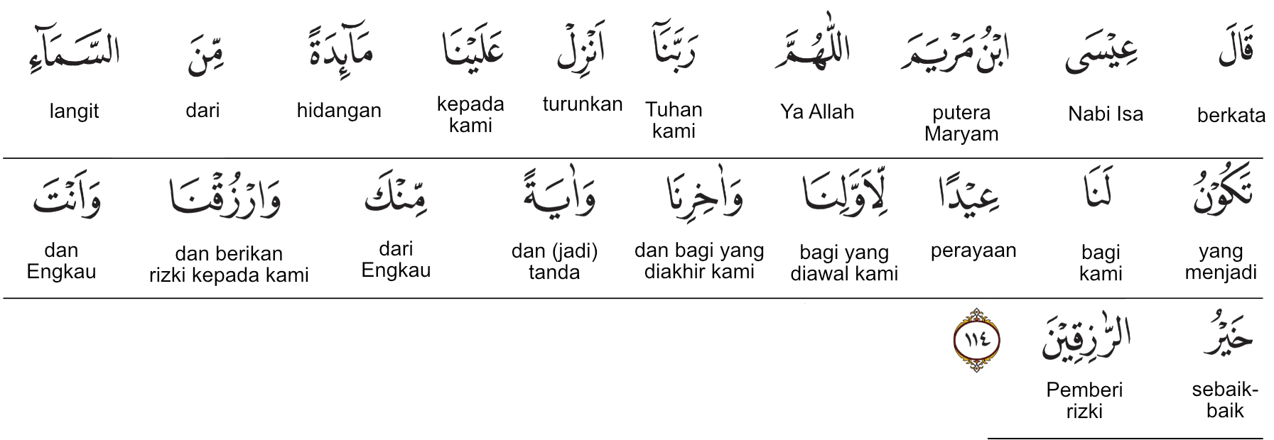 Kemenag RI 2019:Isa putra Maryam berdoa, “Ya Allah Tuhan kami, turunkanlah kepada kami hidangan dari langit (yang hari turunnya) akan menjadi hari raya bagi kami, yaitu bagi orang-orang yang sekarang bersama kami maupun yang datang setelah kami, dan menjadi tanda bagi kekuasaan-Mu. Berilah kami rezeki. Engkaulah sebaik-baik pemberi rezeki.” Prof. Quraish Shihab:‘Isa putra Maryam berdoa: