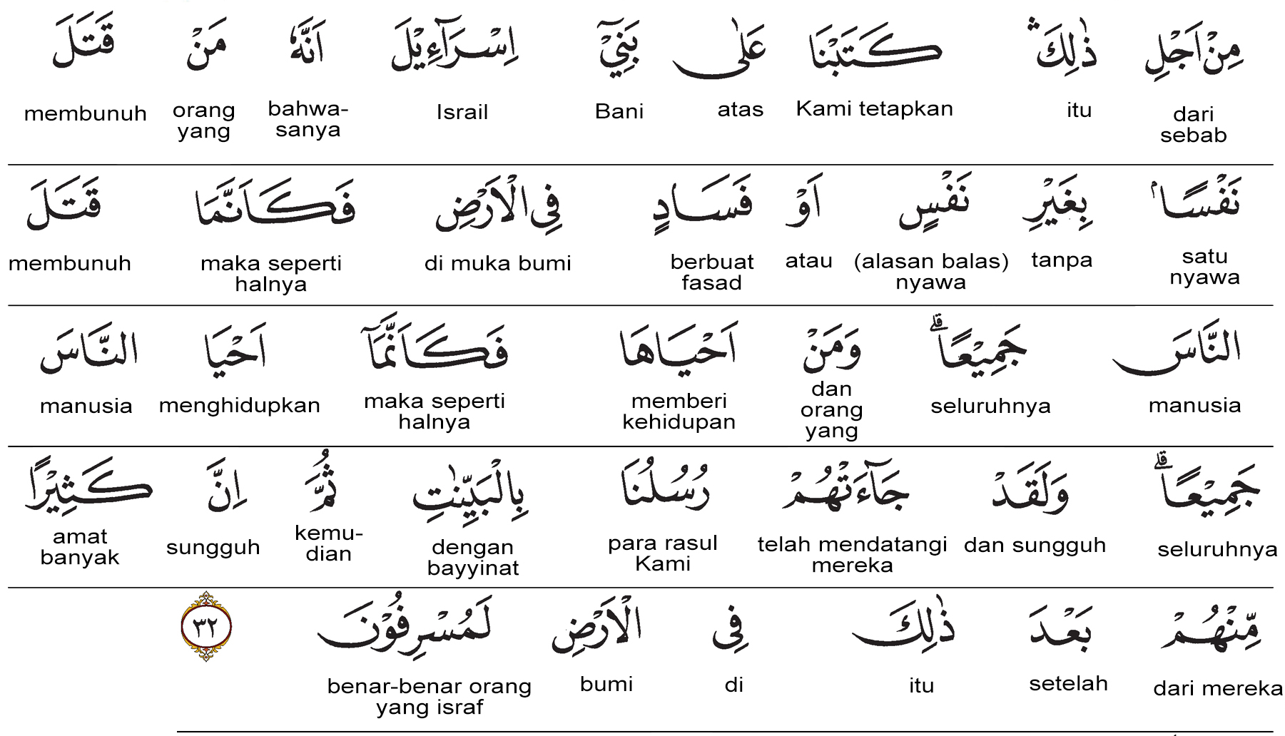 Kata min ajli dzalika (مِنْ أَجْلِ ذَٰلِكَ) artinya : ‘oleh karena itu’atau ‘karena itulah’. Kata katabna (كَتَبْنَا) artinya : Kami tetapkan. Kata ‘ala bani israila (عَلَىٰ بَنِي إِسْرَائِيلَ) artinya : atas Bani Israil.
