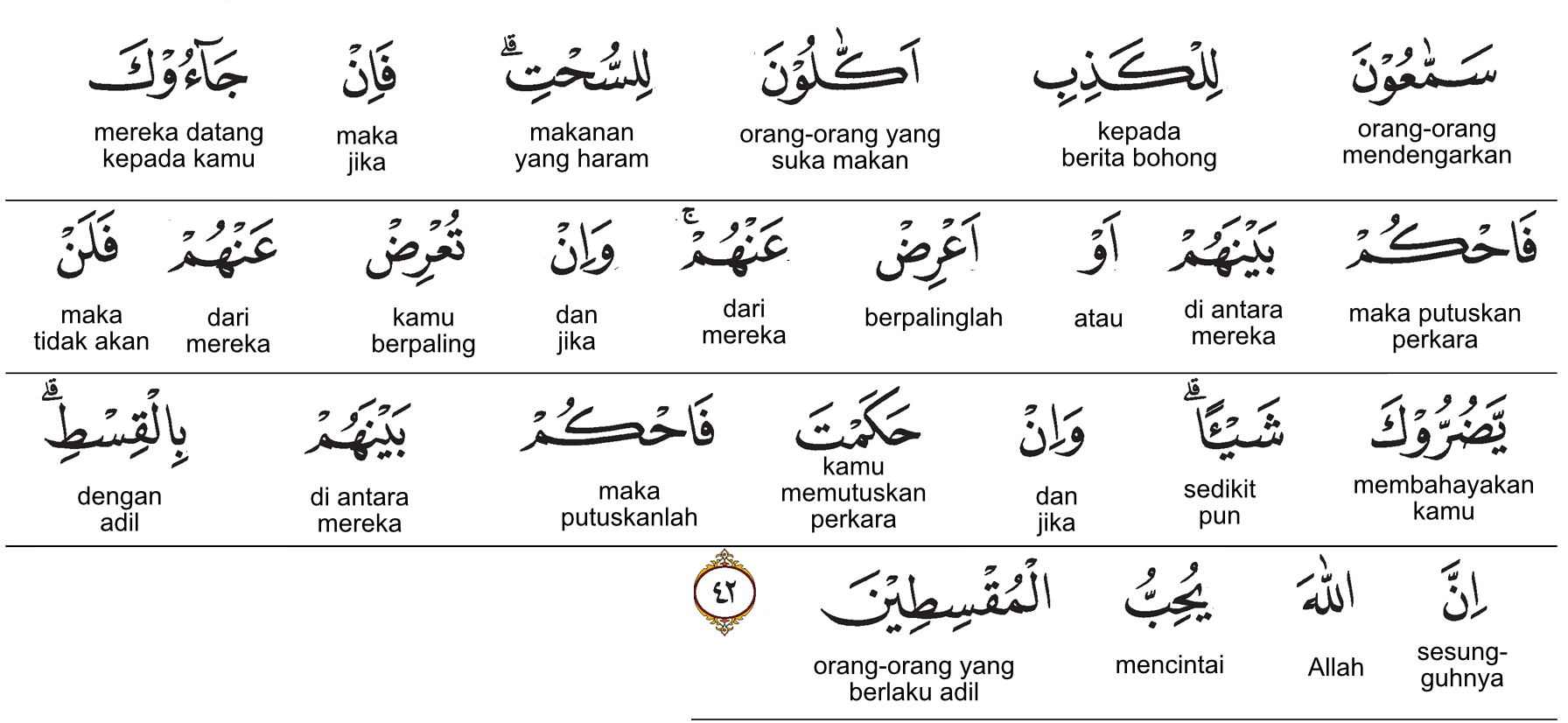 Kemenag RI 2019:Mereka (orang-orang Yahudi itu) sangat suka mendengar berita bohong lagi banyak memakan makanan yang haram. Maka, jika mereka datang kepadamu (Nabi Muhammad untuk meminta putusan), berilah putusan di antara mereka atau berpalinglah dari mereka. Jika engkau berpaling, mereka tidak akan membahayakanmu sedikit pun. Akan tetapi, jika engkau memutuskan (perkara mereka), putuskanlah dengan adil. Sesungguhnya Allah menyukai orang-orang yang adil. Prof. Quraish Shihab: (Orang-orang Yahudi adalah) orang-orang yang suka mendengar kebohongan dan banyak memakan yang haram (seperti riba dan sogok-menyogok). Maka, apabila mereka datang kepadamu maka putuskan-lah (perkara) di antara mereka, atau berpalinglah dari mereka; jika engkau berpaling dari mereka, maka mereka tidak akan memberi mudharat kepadamu sedikit pun. Dan jika engkau memutuskan (perkara) mereka, maka putuskanlah (perkara) di antara mereka dengan adil, sesungguhnya Allah menyukai orang-orang yang berlaku adil. Prof. HAMKA:Mereka suka mendengar-dengar untuk berdusta; mereka suka memakan harta haram. Maka jika mereka datang kepada engkau, hukumlah di antara mereka atau berpalinglah dari mereka. Dan jika engkau berpaling daripada mereka, tidaklah mereka akan membahayakan bagi engkau sesuatu pun. Dan jika engkau menghukum, maka hukumlah di antara mereka dengan adil. Sesungguhnya Allah cinta kepada orang-orang yang berlaku adil.