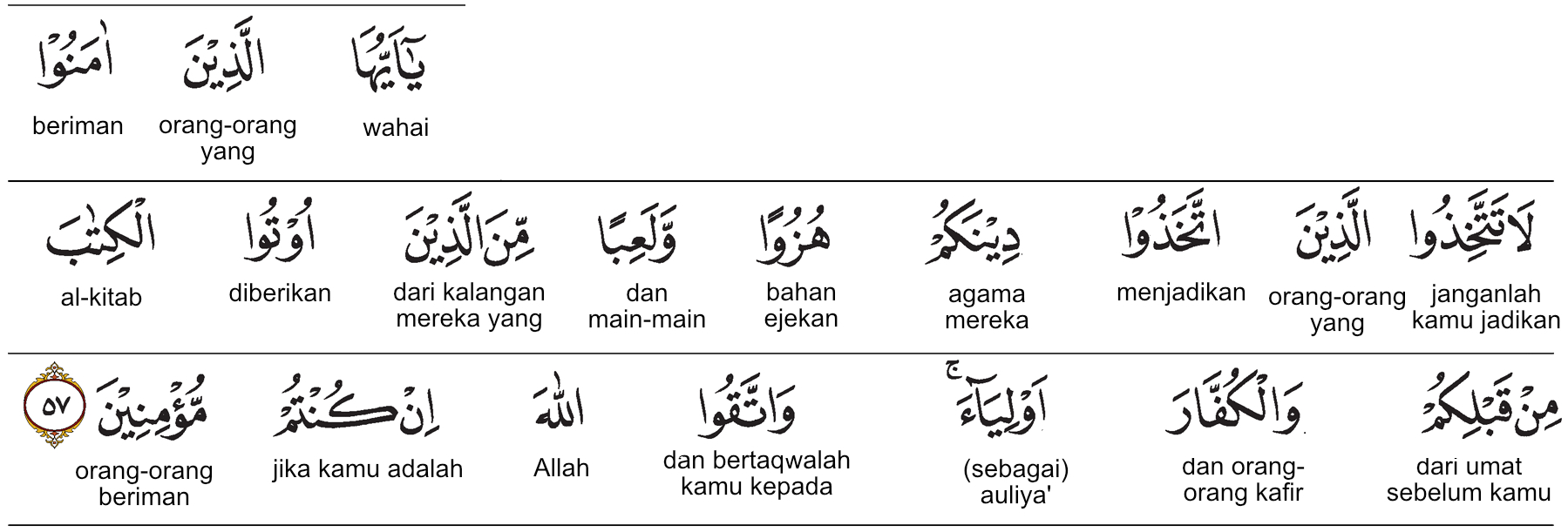 bertakwalah kepada Allah jika kamu orang-orang mukmin. Prof. HAMKA:Wahai orang-orang yang beriman! Janganlah kamu mengambil orang-orang yang telah menjadikan agamamu sebagai ejekan dan permainan—(yaitu) dari orang-orang yang telah diberi kitab sebelum kamu, dan orang-orang yang kafir—sebagai pemimpin-pemimpin. Bertakwalah kepada Allah jika memang kamu orang-orang yang beriman.