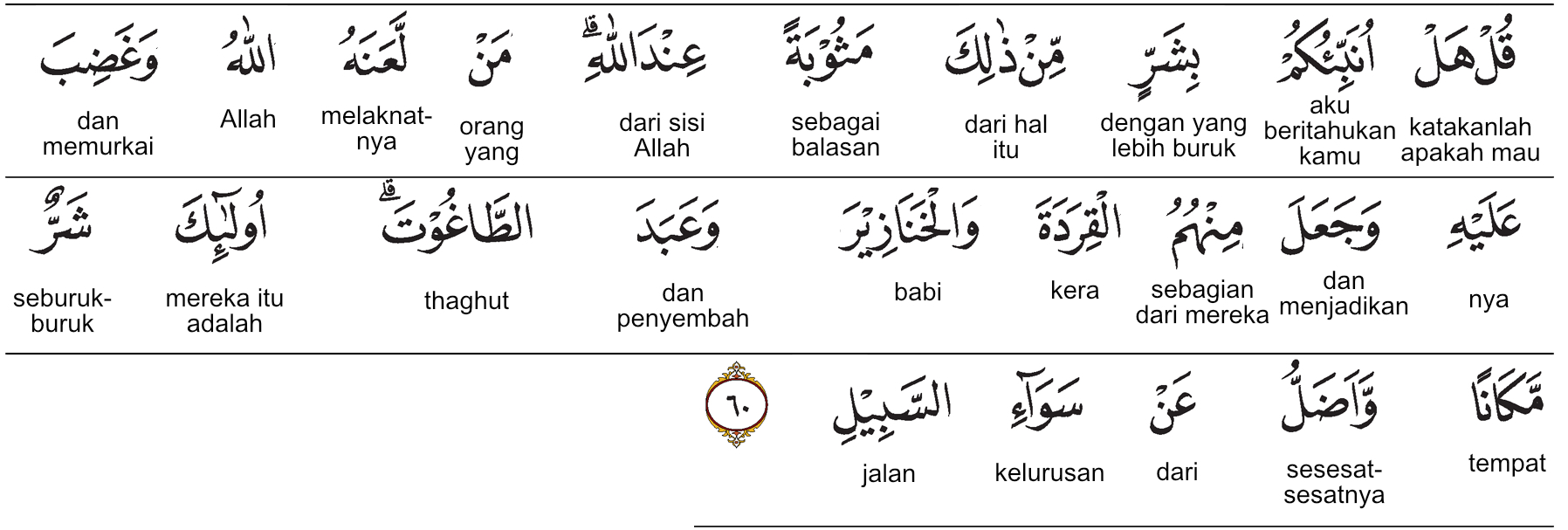 Prof. Quraish Shihab: Katakanlah (Nabi Muhammad saw.): “Apakah akan aku beritahukan kepada kamu tentang (orang-orang) yang lebih buruk pembalasannya dari (orang-orang fasik) itu di sisi Allah? Yaitu, orang-orang yang dilaknat dan dimurkai Allah. Di antara mereka ada yang Dia jadikan kera-kera dan babi- babi; dan (orang) yang menyembah thaghnt?l5b Mereka itu lebih buruk kedudukan-(nya) dan lebih tersesat dari jalan yang lurus.