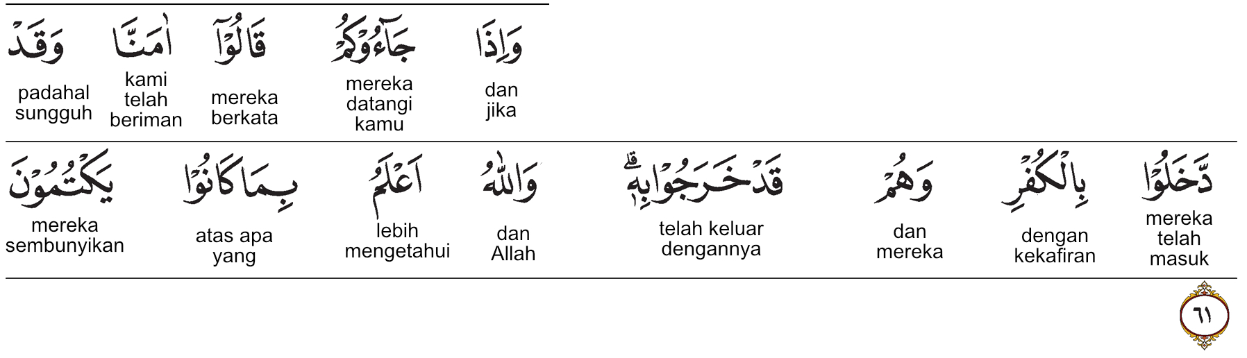 mereka sembunyikan. Prof. HAMKA:Dan apabila mereka datang kepadamu, mereka berkata, "Kami telah beriman!" Padahal sesungguhnya mereka masuk dengan kekafiran dan keluar pun dengan itu juga. Dan Allah lebih mengetahui apa yang mereka sembunyikan.
