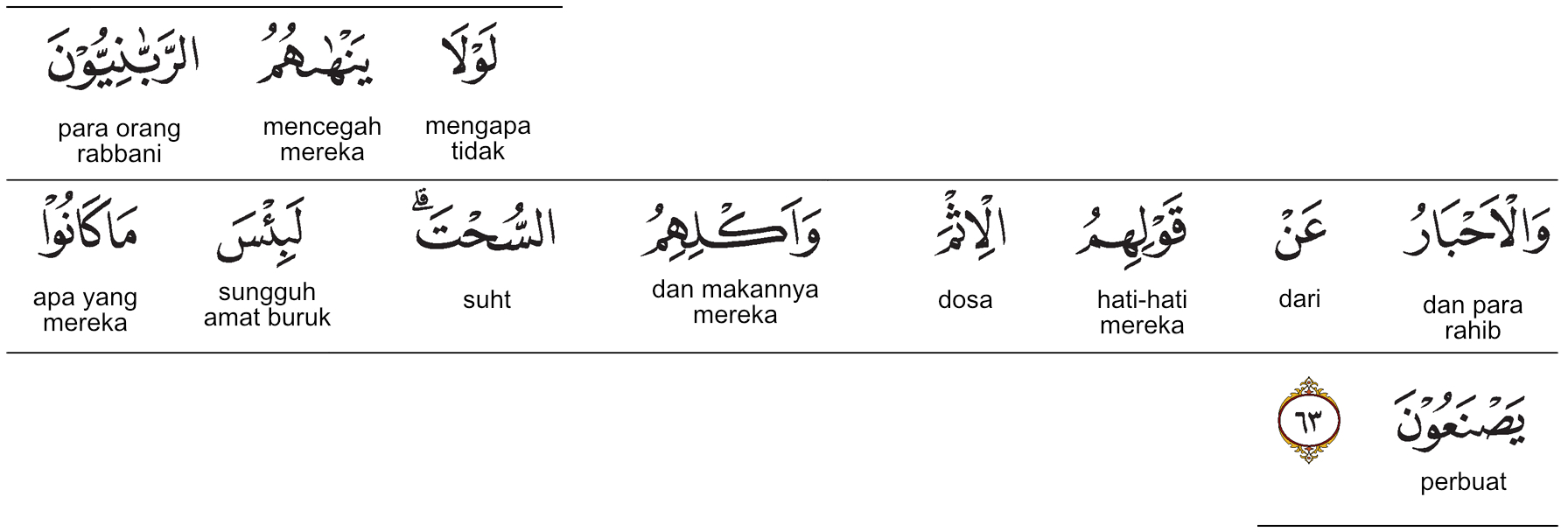 Kemenag RI 2019:Mengapa para ulama dan pendeta tidak melarang mereka mengucapkan perkataan bohong dan memakan (makanan) yang haram? Sungguh, itulah seburuk- buruk apa yang selalu mereka perbuat. Prof. Quraish Shihab:Mengapa rabbdniyyim dan para