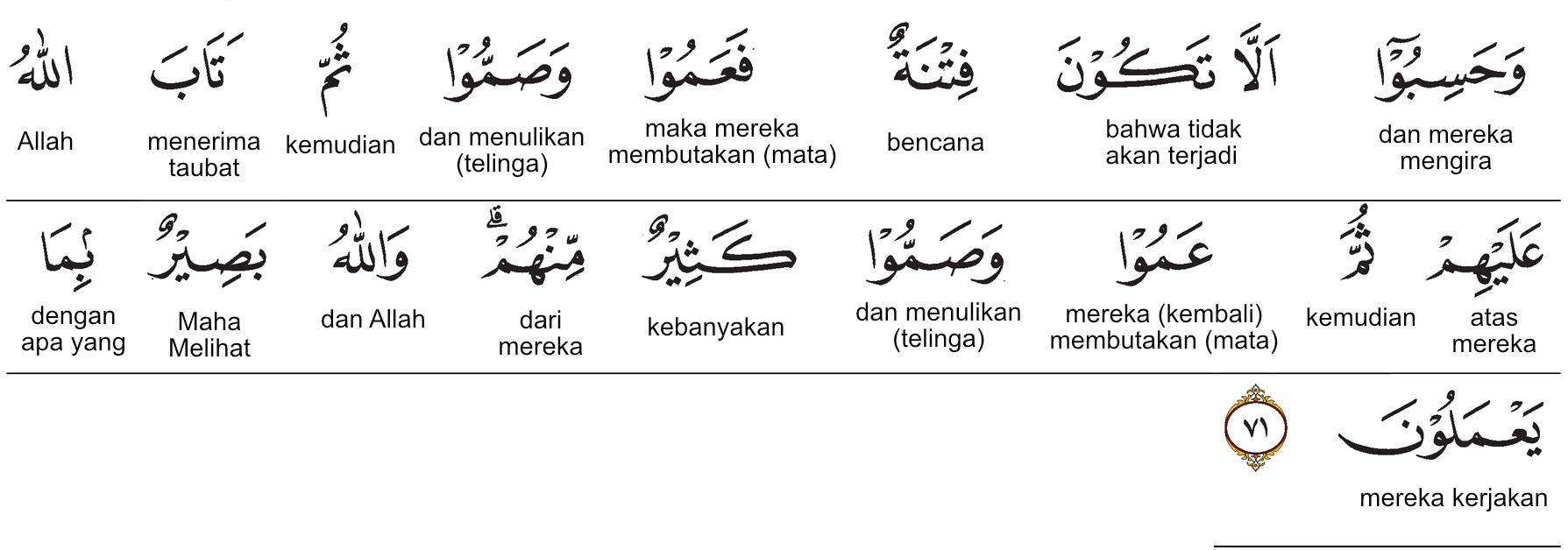 Kemenag RI 2019: Mereka mengira bahwa tidak akan terjadi fitnah (azab akibat dosa-dosa mereka). Oleh karena itu, mereka menjadi buta dan tuli. Setelah itu Allah menerima tobat mereka, kemudian banyak di antara mereka buta dan tuli (lagi). Allah Maha Melihat apa yang mereka kerjakan.