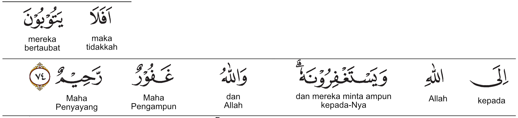 Ayat ke-74 ini menampakkan rasa heran dan takjub secara negatif, seakan tidak percaya melihat penyimpangan dasar-dasar teologi yang dialami para pemuka agama nasrani. Seolah Allah SWT bertanya apakah mereka tidak mau bertobat kepada Allah dan memohon ampunan kepada-Nya?