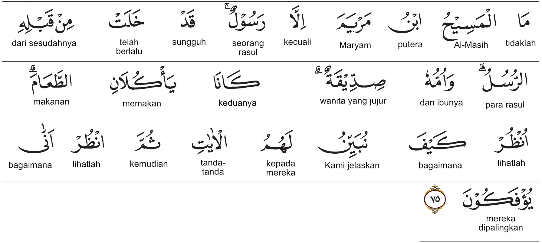 tanda itu). Prof. HAMKA:Al-Masih putra Maryam tidak lain hanyalah seorang rasul, seperti para rasul yang telah mendahuluinya. Dan ibunya adalah seorang wanita yang sangat taat. Keduanya biasa makan makanan seperti manusia lainnya. Perhatikanlah bagaimana Kami menjelaskan tanda-tanda kebesaran Kami kepada mereka, tetapi lihatlah bagaimana mereka tetap berpaling.