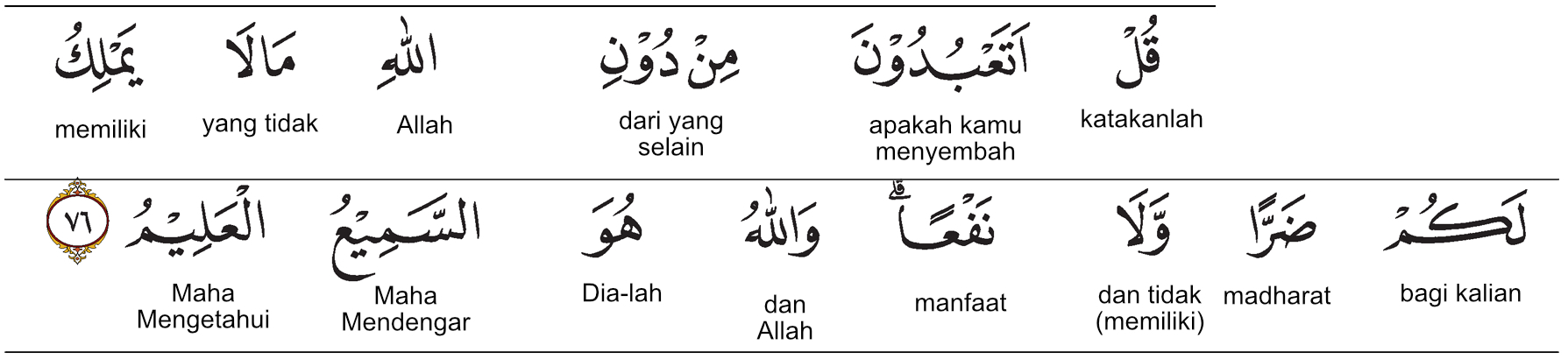 Kata maa laa (مَا لَا) artinya : sesuatu yang tidak. Kata yamliku lakum (يَمْلِكُ لَكُمْ) artinya : memiliki bagi kamu. Kata dharran (ضَرًّا) artinya : membahayakan. Kata wa laa naf’an (وَلَا نَفْعًا) artinya : manfaat.