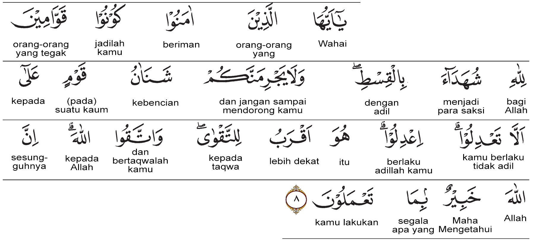 Janganlah kebencianmu terhadap suatu kaum membuatmu berlaku tidak adil. Berlaku adillah, karena keadilan itu lebih dekat kepada takwa. Bertakwalah kepada Allah. Sesungguhnya Allah Maha Teliti terhadap apa yang kamu kerjakan. Prof. HAMKA:Wahai orang-orang yang beriman! Hendaklah kamu menjadi orang yang lurus karena Allah, menjadi saksi dengan adil, dan janganlah karena kebencian dari suatu kaum, kamu tidak berlaku adil. Berlaku adillah! Itulah yang akan mendekatkan kamu kepada takwa. Dan bertakwalah kepada Allah, sesungguhnya Allah Maha Mengetahui apa yang kamu kerjakan.