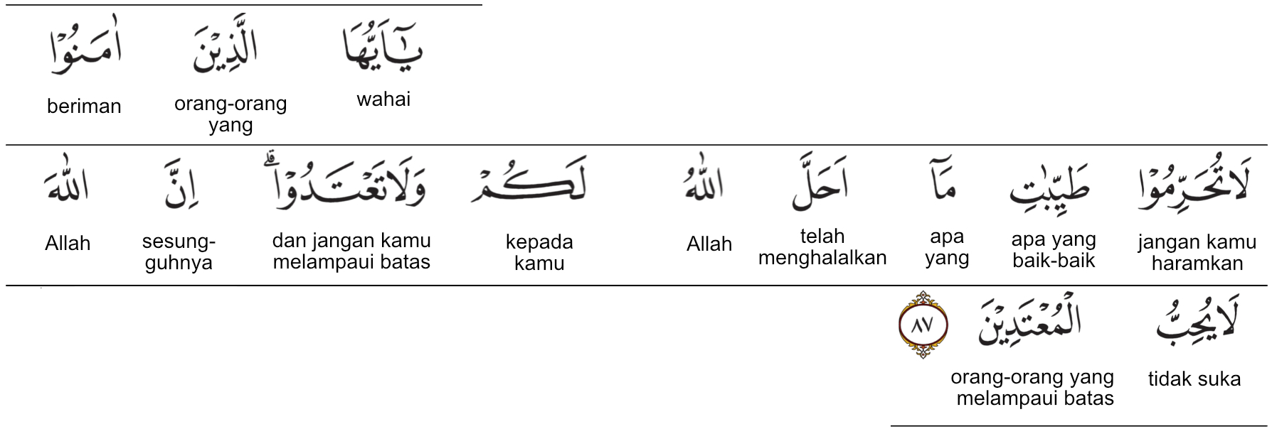 Prof. HAMKA:Wahai orang-orang yang beriman! Janganlah kamu haramkan barang baik yang telah dihalalkan Allah bagi kamu dan janganlah kamu melampaui batas. Sesungguhnya Allah tidak suka kepada orang-orang yang melampaui batas.
