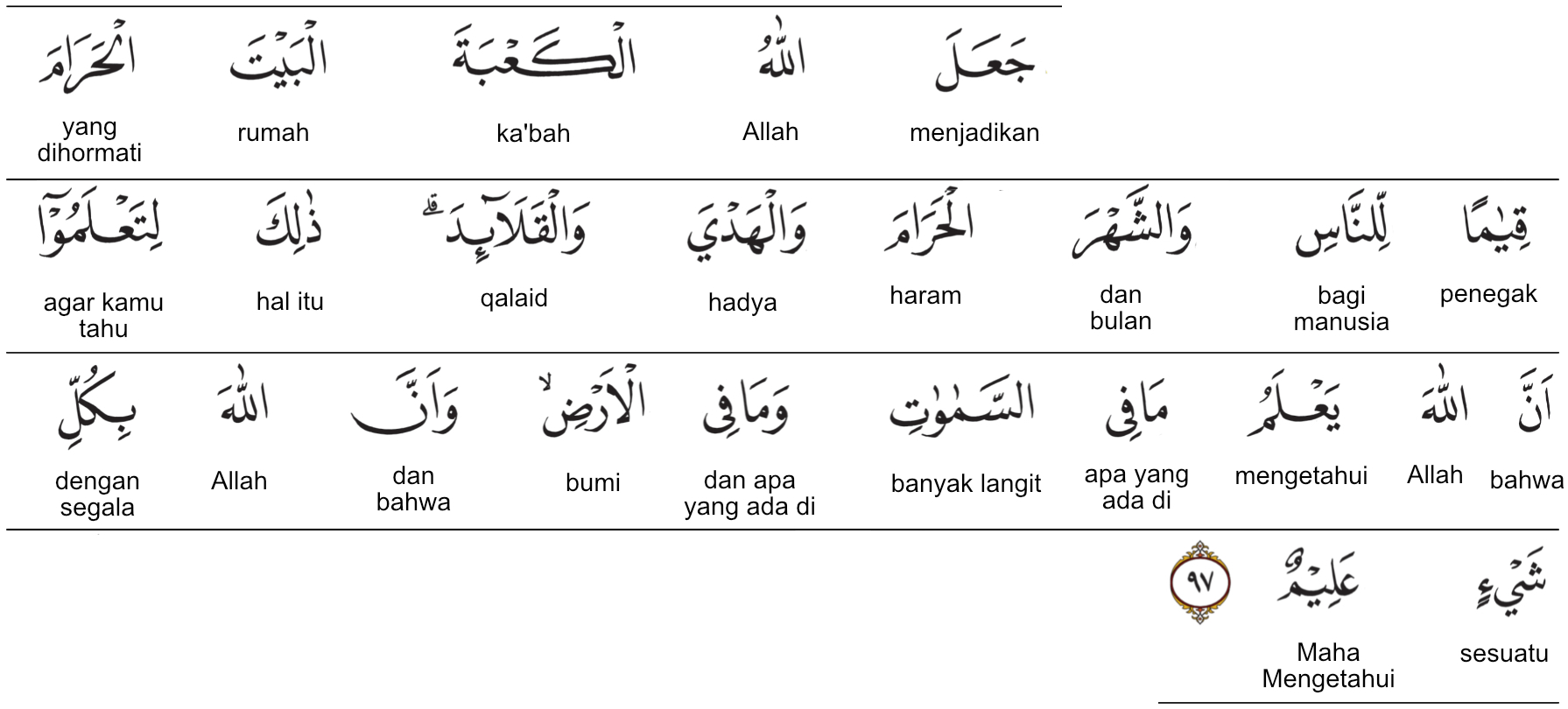 Kemenag RI 2019: Allah telah menjadikan Ka‘bah, rumah suci itu sebagai pusat kegiatan (peribadatan dan urusan dunia) ) bagi manusia, dan (demikian pula) bulan haram, hadyu (hewan kurban) dan qala?’id (hewan kurban yang diberi kalung). Yang demikian itu agar kamu mengetahui bahwa sesungguhnya Allah mengetahui apa pun yang ada di langit dan apa pun yang ada di bumi dan bahwa Allah Maha Mengetahui segala sesuatu.