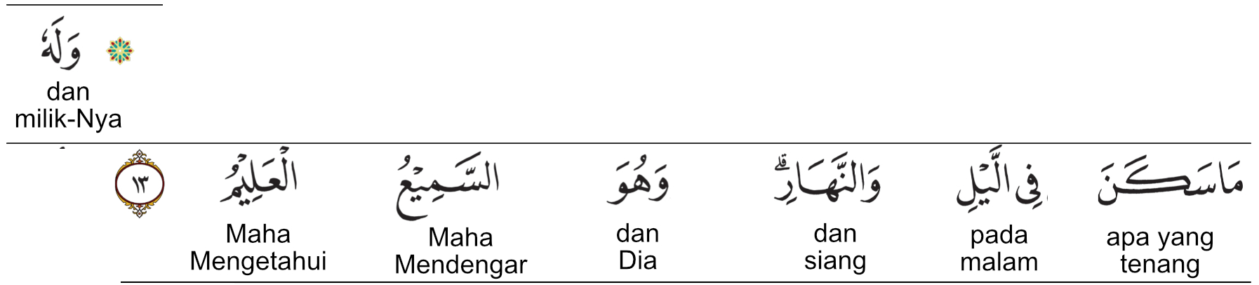 Kata wa (وَ) artinya : dan. Kata lahu (لَهُ) artinya : bagi-Nya. Kata ma (مَا) artinya : apa. Kata sakana (سَكَنَ) diterjemahkan secara berbeda-beda. Kemenag RI menuliskan : ‘sesuatu yang ada’. Begitu juga Prof. Quraish Shihab menuliskan : ‘segala yang ada’. Namun yang agak berbeda adalah Buya HAMKA, versi beliau adalah : ’apa yang tenang’.
