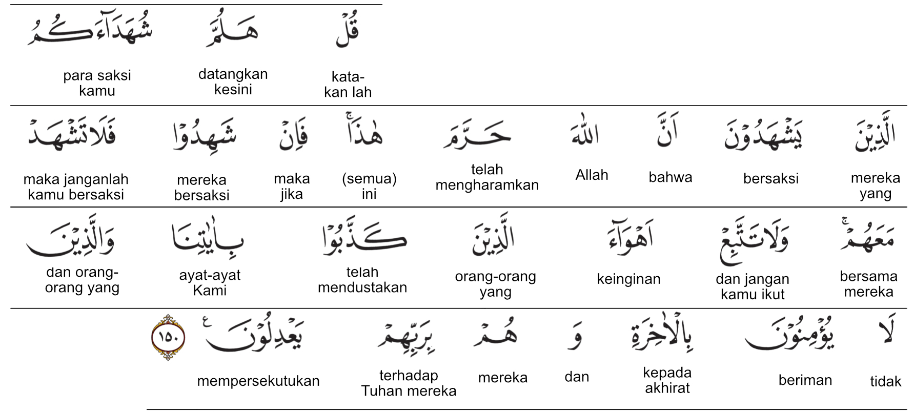 Kemenag RI 2019:Katakanlah (Nabi Muhammad), “Bawalah saksi-saksimu yang dapat membuktikan bahwa Allah mengharamkan ini.” Jika mereka memberi kesaksian, engkau jangan (ikut pula) memberi kesaksian bersama mereka. Jangan engkau ikuti keinginan orang-orang yang mendustakan ayat-ayat Kami dan orang-orang yang tidak beriman kepada akhirat dan mempersekutukan Tuhan. Prof. Quraish Shihab:Katakanlah (Nabi Muhammad saw.): “Hadirkanlah para saksi kamu yang dapat memberikan kesaksian bahwa Allah telah mengharamkan ini.” Jika mereka memberikan kesaksian, maka janganlah engkau (Nabi Muhammad saw.) memberi kesaksian bersama mereka; dan jangan (pula) engkau mengikuti hawa nafsu orang-orang yang mendustakan ayat-ayat Kami dan orang-orang yang tidak beriman kepada (kehidupan) akhirat, sedangkan mereka menyekutukan (sesuatu) dengan Tuhan Pemelihara mereka. Prof. HAMKA:Katakanlah, “Bawalah kemari saksi-saksi kamu yang akan menyaksikan bahwa Allah telah mengharamkan ini.” Tetapi, jika mereka telah menyaksikan maka janganlah engkau menjadi saksi bersama mereka dan janganlah engkau ikuti hawa nafsu orang-orang yang mendustakan ayat-ayat Kami dan orang-orang yang tidak percaya kepada akhirat itu, sedang mereka terhadap Tuhan mereka adalah mempersekutukan.