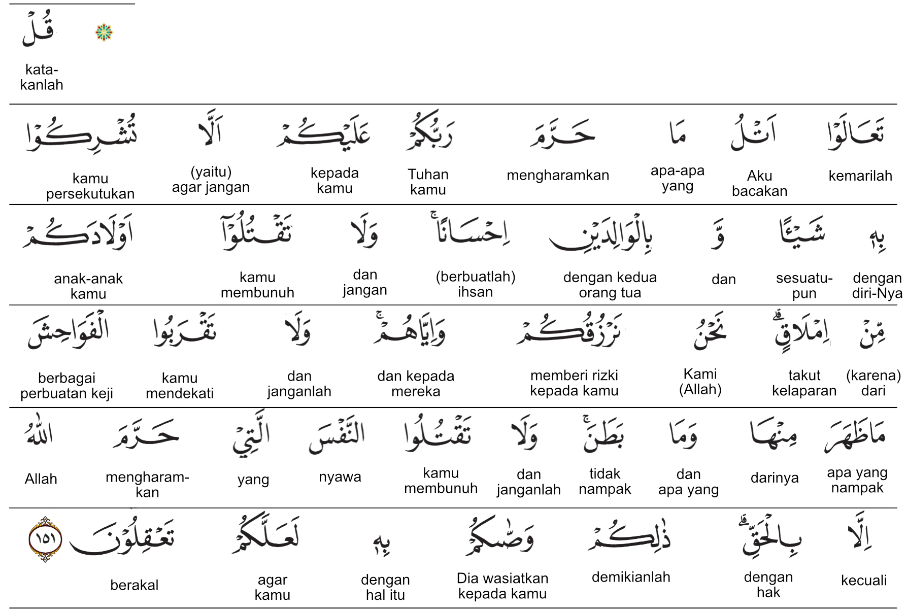 Kemenag RI 2019:Katakanlah (Nabi Muhammad), “Kemarilah! Aku akan membacakan apa yang diharamkan Tuhan kepadamu, (yaitu) janganlah mempersekutukan-Nya dengan apa pun, berbuatbaiklah kepada kedua orang tua, dan janganlah membunuh anak-anakmu karena kemiskinan. (Tuhanmu berfirman,) ‘Kamilah yang memberi rezeki kepadamu dan kepada mereka.’ Janganlah pula kamu mendekati perbuatan keji, baik yang terlihat maupun yang tersembunyi. Janganlah kamu membunuh orang yang diharamkan Allah, kecuali dengan alasan yang benar. ) Demikian itu Dia perintahkan kepadamu agar kamu mengerti. Prof. Quraish Shihab:Katakanlah: “Marilah aku bacakan apa yang diharamkan atas kamu oleh Tuhanmu: janganlah kamu mempersekutukan-Nya dengan sesuatu apa pun; berbuat baiklah kepada kedua orang tua, kaum kerabat, anak yatim, orang miskin, tetangga yang dekat, tetangga yang jauh, teman sejawat dan musafir; dan janganlah kamu memboroskan harta dengan boros yang berlebihan. Sesungguhnya orang-orang yang boros itu adalah saudara setan, dan setan itu adalah sangat ingkar kepada Tuhannya.” Prof. HAMKA:Katakanlah, “Kemarilah supaya aku bacakan apa yang diharamkan oleh Tuhan kamu kepada kamu. (Yaitu) bahwa janganlah kamu mempersekutukan dengan Dia sesuatu pun dan dengan kedua ibu-bapak hendaklah berbuat baik dan janganlah kamu bunuh anak-anak kamu karena kepapaan. Kamilah yang memberi rezeki kamu dan kepada mereka. Dan jangan kamu dekati segala kejahian yang zahir daripadanya dan yang batin dan jangan kamu bunuh suatu jiwa yang diharamkan oleh Allah kecuali dengan hak. Demikian itulah Dia wasiatkan kepada kamu supaya kamu mengerti.”