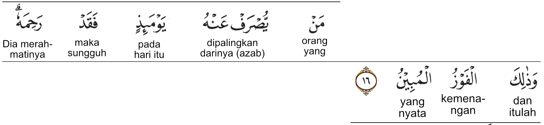 Kemenag RI 2019: Siapa yang dijauhkan darinya (azab) pada hari itu, maka sungguh Dia telah merahmatinya. Itulah keberuntungan yang nyata.