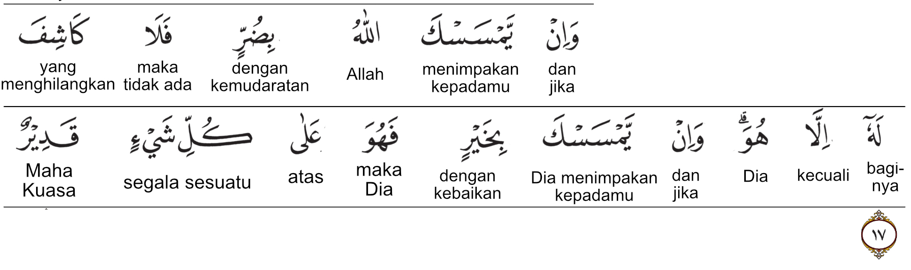 Ayat ke-17 dari surat Al-An’am ini mengandung pesan yang amat penting dan mendalam, yaitu jika Allah SWT sudah ingin menimpakan kemudaratan, maka tidak ada yang dapat menghilangkannya. Mudharat itu pasti akan terus menguntit kemanapun dan sampai kapan pun.