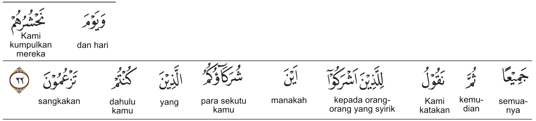 Kemenag RI 2019:(Ingatlah) tatkala Kami kumpulkan mereka semua kemudian Kami berfirman kepada orang-orang yang mempersekutukan Kami, “Manakah sekutu-sekutumu yang kamu sangkakan?” Prof. Quraish Shihab:Dan (ingatlah kebohongan mereka terhadap Allah swt. di dunia ini) pada hari (ketika) Kami mengumpulkan mereka semua, kemudian Kami berkata kepada orang-orang yang menyekutukan (Allah swt.): "Di manakah sembahan-sembahan kamu yang dahulu kamu anggap (sekutu-sekutu Kami)?" Prof. HAMKA:Dan pada hari Kami mengumpulkan mereka semuanya, kemudian Kami berkata kepada orang-orang yang mempersekutukan, "Di manakah sekutu-sekutu kamu yang dahulunya kamu duga?"