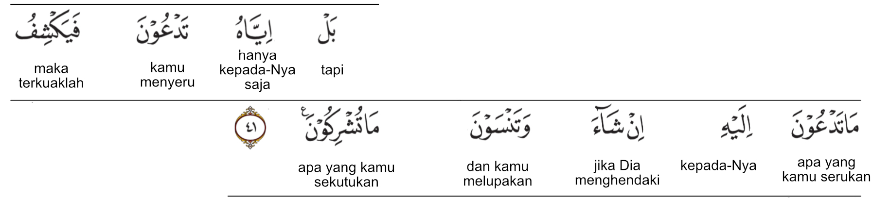 Kemenag RI 2019:Tidak! Hanya kepada-Nya kamu menyeru. Maka, jika Dia menghendaki, Dia hilangkan apa (bahaya dan siksa) yang (karenanya) kamu memohon kepada-Nya, dan (karena dahsyatnya keadaan) kamu tinggalkan apa yang kamu persekutukan (dengan Allah). Prof. Quraish Shihab:Tidak! Tetapi hanya Dia-lah yang kamu seru, maka Dia menghilangkan apa (bahaya dan siksa) yang karenanya kamu berdoa kepada-Nya jika Dia menghendaki. Dan (karena dahsyatnya bahaya dan mencekamnya keadaan) kamu lupakan apa (sembahan-sembahan) yang kamu sekutukan (dengan Allah swt.). Prof. HAMKA:Bahkan, Dialah yang kamu seru maka Dialah yang akan melepaskan apa yang kamu mohonkan kepada-Nya itu, jika Dia kehendaki dan akan lupakan kamu kepada apa yang kamu persekutukan itu.