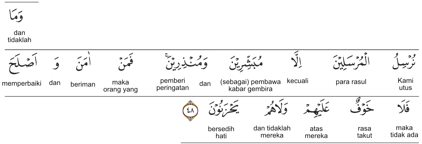 Kemenag RI 2019:Tidaklah Kami utus para rasul melainkan untuk memberi kabar gembira dan memberi peringatan. Siapa beriman dan mengadakan perbaikan, maka tidak ada rasa takut pada mereka dan mereka tidak bersedih hati. Prof. Quraish Shihab:Dan tidaklah Kami mengutus para rasul melainkan sebagai pembawa kabar gembira dan pemberi peringatan. Barang siapa beriman dan mengadakan perbaikan, maka tidak ada rasa takut pada mereka, dan tidak (pula) mereka bersedih hati. Prof. HAMKA:Dan tidaklah Kami mengutus rasul-rasul itu melainkan sebagai pembawa berita gembira dan berita ancaman. Maka barangsiapa yang beriman dan berbuat perbaikan, tiadalah ada ketakutan atas mereka dan tiadalah mereka berduka cita.