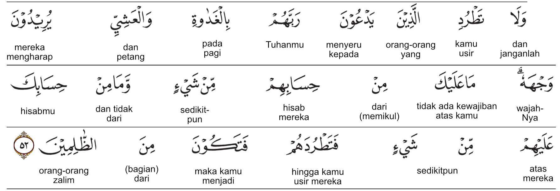 Kemenag RI 2019:Janganlah engkau (Nabi Muhammad) mengusir orang-orang yang menyeru Tuhannya pada pagi dan petang hari, sedangkan mereka mengharapkan keridaan-Nya. Engkau tidak memikul tanggung jawab sedikit pun terhadap perbuatan mereka dan mereka (pun) tidak memikul tanggung jawab sedikit pun terhadap perbuatanmu, sehingga engkau (tidak berhak) mengusir mereka. (Jika dilakukan,) engkau termasuk orang-orang yang zalim. ) Prof. Quraish Shihab:Dan janganlah engkau (Nabi Muhammad saw.) mengusir orang-orang (miskin) yang menyeru Tuhan Pemelihara mereka di pagi hari dan di petang hari, sedangkan mereka menghendaki keridaan-Nya. Engkau tidak memikul sedikit pun perhitungan (tanggung jawab) terhadap mereka, dan mereka tidak memikul sedikit pun perhitungan (tanggung jawab) terhadap engkau. Maka, (jika) engkau mengusir mereka, engkau termasuk orang-orang yang zalim. Prof. HAMKA:Dan janganlah engkau usir orang-orang yang menyeru Tuhan mereka pada pagi hari dan petang yang menginginkan wajah Tuhannya. Tidaklah kewajiban engkau atas sesuatu dari perhitungan mereka. Dan tidak (pula) kewajiban mereka atas sesuatu dari perbuatan engkau. Maka bila engkau usir mereka, jadilah engkau dari orang-orang yang zalim.
