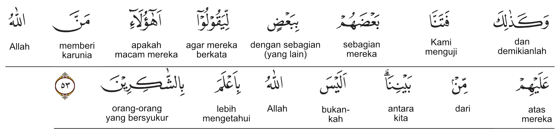 Prof. Quraish Shihab: Dan demikianlah telah Kami uji sebagian mereka dengan sebagian yang lain, sehingga mereka (yang kaya dan berkuasa) berkata, “Orang-orang semacam inikah (yang status sosialnya sangat rendah) di antara kita yang dianugerahi (karunia) oleh Allah kepada mereka?” Tidakkah Allah lebih mengetahui tentang orang-orang yang bersyukur (kepada-Nya)?