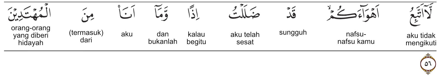 Kemenag RI 2019:Katakanlah (Nabi Muhammad), “Sesungguhnya aku dilarang menyembah tuhan-tuhan yang kamu sembah selain Allah.” Katakanlah, “Aku tidak akan mengikuti keinginanmu. Jika berbuat demikian, sungguh tersesatlah aku, dan aku tidak termasuk orang yang mendapat petunjuk.” Prof. Quraish Shihab:Katakanlah (Nabi Muhammad saw.), “Sesungguhnya aku dilarang menyembah (sesuatu) yang kamu sembah selain Allah.” Katakanlah, “Aku tidak akan mengikuti hawa nafsu kamu, sungguh sesatlah aku jika (berbuat) demikian, dan tidaklah (pula) aku termasuk orang-orang yang mendapat petunjuk.” Prof. HAMKA:Katakanlah, “Sesungguhnya aku telah dilarang menyembah apa yang kamu seru selain dari Allah itu.” Katakanlah, “Tidakkah aku akan mengikuti kehendak kamu. Karena sesungguhnya telah sesatlah aku kalau begitu dan tidaklah aku daripada orang-orang yang diberi petunjuk.”