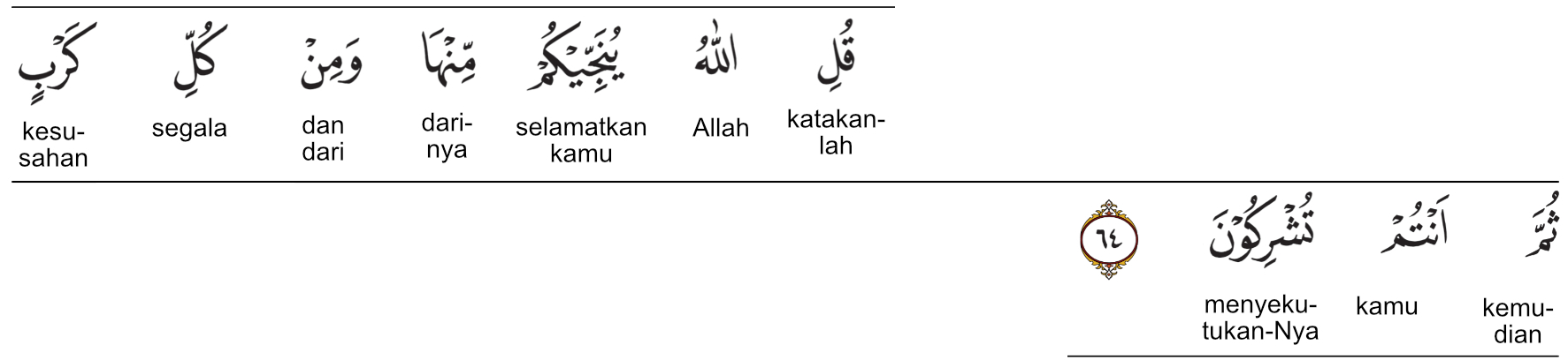 Kemenag RI 2019: Katakanlah (Nabi Muhammad), “Allah yang menyelamatkanmu darinya (bencana itu) dan dari segala macam kesusahan. Kemudian, kamu (kembali) mempersekutukan-Nya.”