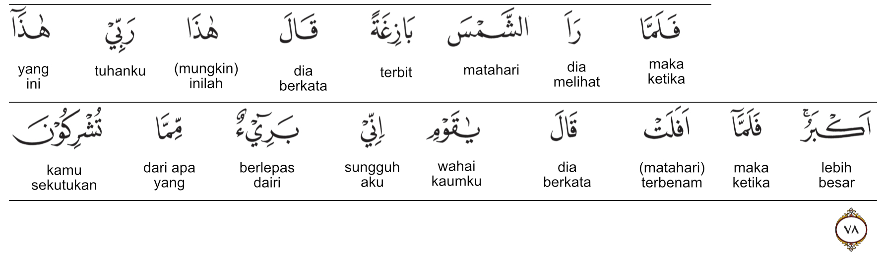 Kata falammaa (فَلَمَّا) artinya : maka tatkala. Kata ra’a (رَأَى) artinya : ia melihat. Kata asy-syamsa (الشَّمْسَ) artinya : matahari. Kata bazighatan (بَازِغَةً) artinya : terbit.