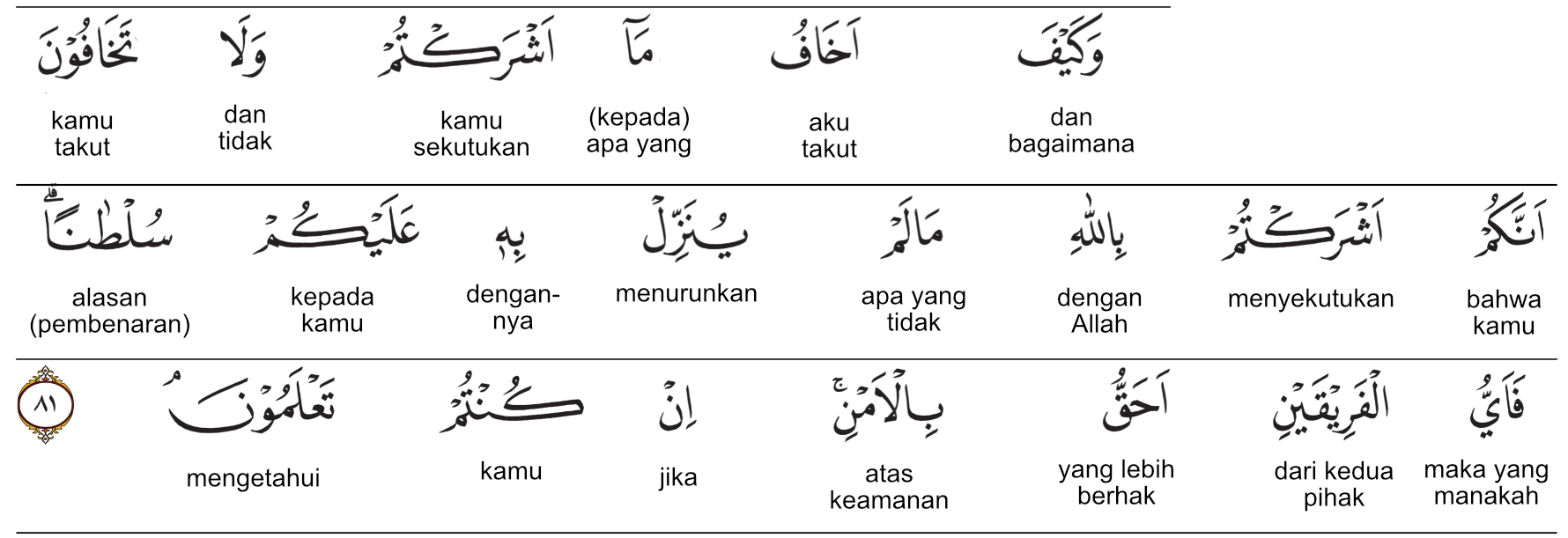 Kemenag RI 2019:Bagaimana mungkin aku takut kepada yang kamu sekutukan (dengan Allah), padahal kamu tidak takut menyekutukan sesuatu dengan Allah yang Dia (sendiri) tidak pernah menurunkan kepadamu alasan apa pun. Maka, golongan yang manakah dari keduanya yang lebih berhak mendapat keamanan (dari malapetaka) jika kamu mengetahui?” ) Prof. Quraish Shihab:Bagaimana aku takut kepada apa yang kamu sekutukan, padahal kamu tidak takut menyekutukan Allah dengan sesuatu yang Dia tidak menurunkan alasan (pembenaran) kepadamu tentangnya? Maka, manakah di antara dua golongan itu yang lebih berhak mendapat keamanan (dari siksa dan malapetaka), jika kamu mengetahui? Prof. HAMKA:Dan betapa aku akan takut kepada apa yang kamu persekutukan itu padahal kamu tidak takut bahwa kamu telah mempersekutukan dengan Allah barang yang tidak diturunkannya kepada kamu suatu keterangan pun tentang itu? Maka yang manakah di antara kedua golongan itu yang lebih patut mendapat keamanan? Jika adalah kamu mengetahui?