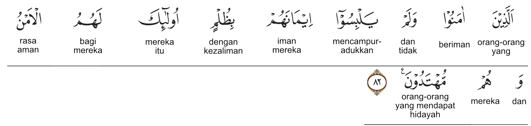 Kemenag RI 2019:Orang-orang yang beriman dan tidak mencampuradukkan iman mereka dengan kezaliman (syirik), merekalah orang-orang yang mendapat rasa aman dan mendapat petunjuk. Prof. Quraish Shihab:Orang-orang yang beriman dan tidak mencampuradukkan iman mereka dengan kezaliman (syirik), mereka itulah orang-orang yang mendapat keamanan, dan mereka itulah orang-orang yang mendapat petunjuk. Prof. HAMKA:Orang-orang yang beriman dan tidak mencampurkan iman mereka dengan kegelapan adalah bagi mereka itu keamanan dan mereka itulah orang-orang yang mendapat hidayah.