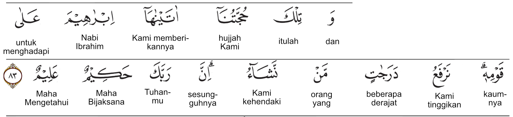 Prof. HAMKA: Dan inilah hujjah Kami yang telah Kami datangkan kepada Ibrahim untuk menghadapi kaumnya. Kami angkatkan beberapa derajat barangsiapa yang Kami kehendaki. Sesungguhnya Tuhan engkau adalah Mahabijaksana Maha Mengetahui.