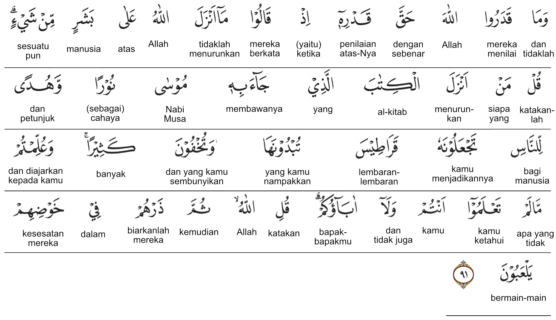 Kemenag RI 2019:Mereka (Bani Israil) tidak mengagungkan Allah sebagaimana mestinya ketika mereka berkata, “Allah tidak menurunkan sesuatu pun kepada manusia.” Katakanlah (Nabi Muhammad), “Siapakah yang menurunkan kitab suci (Taurat) yang dibawa Musa sebagai cahaya dan petunjuk bagi manusia? Kamu (Bani Israil) menjadikannya lembaran-lembaran lepas. Kamu memperlihatkan (sebagiannya) dan banyak yang kamu sembunyikan, padahal telah diajarkan kepadamu apa yang tidak diketahui baik olehmu maupun oleh nenek moyangmu.” Katakanlah, “Allah.” Kemudian, biarkanlah mereka bermain-main dalam kesesatannya. ) Prof. Quraish Shihab:Mereka tidak mengagungkan Allah dengan pengagungan yang semestinya ketika mereka berkata, “Allah tidak menurunkan sesuatu pun kepada manusia.” Katakanlah (Nabi Muhammad saw.), “Siapakah yang menurunkan Kitab (Taurat) yang dibawa oleh Musa sebagai cahaya dan petunjuk bagi manusia? Kamu menjadikannya lembaran-lembaran kertas (yang bercerai-berai); sebagian kamu perlihatkan, dan banyak yang kamu sembunyikan. Dan telah diajarkan kepadamu apa yang kamu dan nenek moyangmu tidak mengetahuinya.” Katakanlah, “Allah (yang menurunkannya).” Kemudian biarkanlah mereka bermain-main dalam kesesatan mereka. Prof. HAMKA:Dan tidaklah mereka menilai Allah dengan sebenar-benar penilaian ketika mereka berkata, "Tidakkah Allah menurunkan sesuatu kepada manusia." Katakanlah, "Siapakah yang telah menurunkan kitab yang telah dibawa oleh Musa sebagai cahaya dan petunjuk bagi manusia yang kamu jadikan kertas-kertas, kamu terangkan akan dia dan kamu sembunyikan yang lebih banyak dan telah diajarkan kepada kamu apa yang tidak kamu ketahui, dan tidak pun (diketahui) oleh bapak-bapak kamu." Kata kanlah, "Allah!" Kemudian itu biarkanlah mereka itu bermain-main dalam kesesatan mereka.