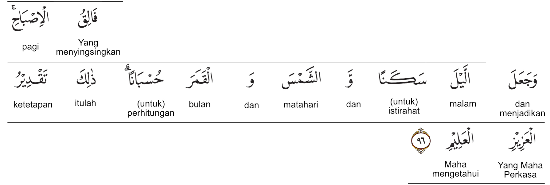 Kemenag RI 2019:(Dia) yang menyingsingkan pagi dan menjadikan malam untuk beristirahat, serta (menjadikan) matahari dan bulan untuk perhitungan. Itulah ketetapan Allah Yang Maha Perkasa lagi Maha Mengetahui. Prof. Quraish Shihab:Dia (Allah) Yang menjadikan pagi, dan Dia menjadikan malam untuk beristirahat, dan (menjadikan) matahari dan bulan untuk perhitungan. Itulah ketetapan Allah Yang Maha Perkasa, Maha Mengetahui. Prof. HAMKA:Sesungguhnya Allah lah Pembe lah buah dan biji. Dia mengeluarkan yang hidup dari yang mati, pengeluar yang mati dari yang hidup. Demikian itulah Allah maka kemana lagi kamu akan dipalingkan?