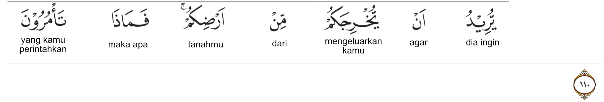 Kemenag RI 2019:Dia hendak mengusir kamu dari negerimu.” (Fir‘aun berkata,) “Maka, apa saran kamu?” Prof. Quraish Shihab:Dia (Nabi Musa as.) hendak mengeluarkan kamu dari negeri kamu. Maka, apakah yang kamu perintahkan?” Prof. HAMKA:Dia hendak mengeluarkan kamu dari bumi kamu; apakah yang akan kamu perintahkan?