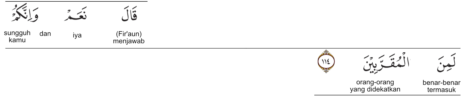 Ayat ke-114 dari surat Al-A'raf ini menggambarkan jawaban langsung dari Fir'aun atas permintaan para penyihir yang sebelumnya menanyakan imbalan jika mereka berhasil mengalahkan Nabi Musa. Fir‘aun tidak hanya menyetujui permintaan tersebut, tetapi bahkan menawarkan sesuatu yang lebih besar dari sekadar upah.
