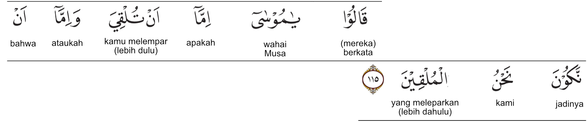Kemenag RI 2019:Mereka (para penyihir) berkata, “Wahai Musa, engkaukah yang akan melemparkan (lebih dahulu) atau kami yang melemparkan?” Prof. Quraish Shihab:Mereka (para penyihir) berkata: “Wahai Musa! Engkau yang melemparkan (terlebih dahulu), dan bisa (juga) kami yang menjadi pelempar.” Prof. HAMKA:Mereka berkata, “Hai Musa! Engkaukah yang akan melempar kart (lebih dahulu) atau kamikah yang akan terlebih dahulu melemparkan?”