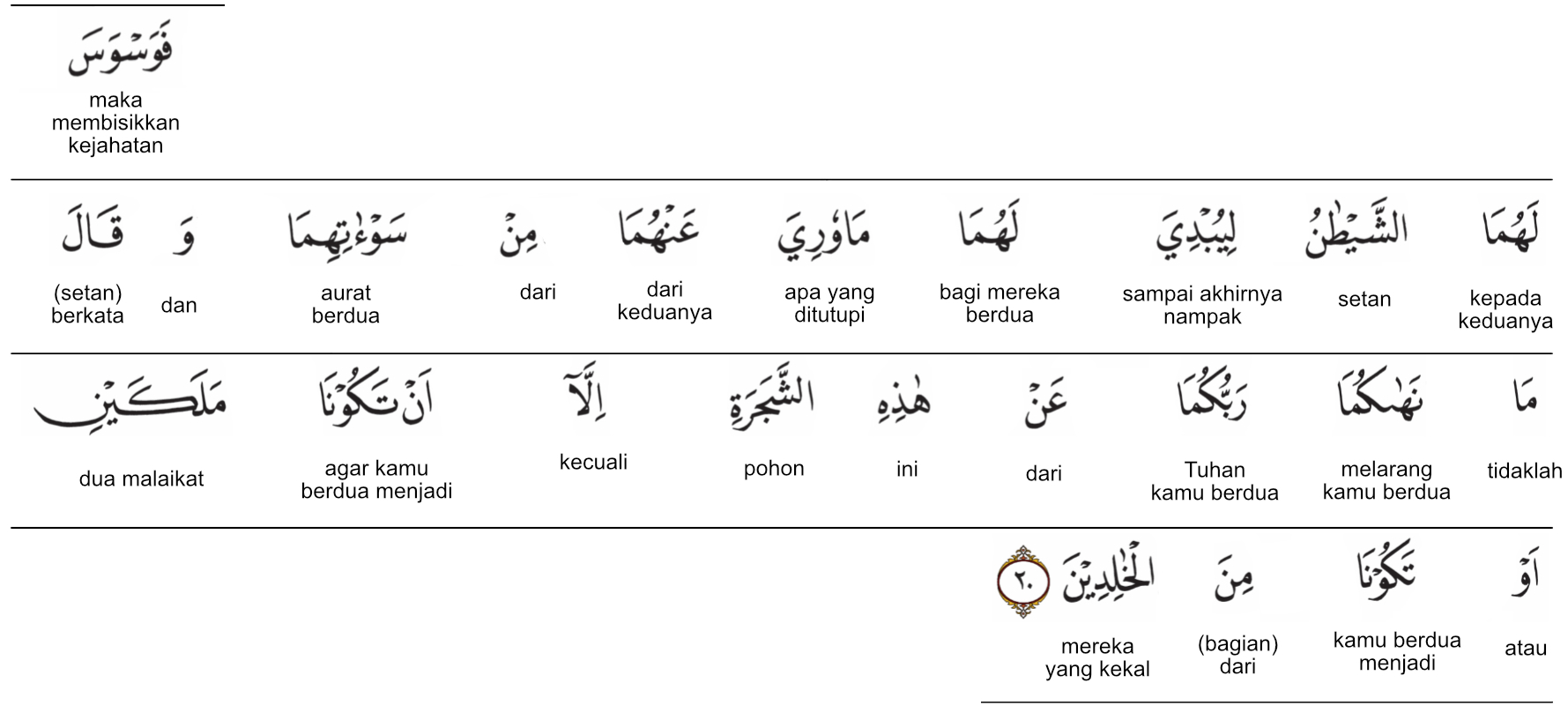 Kemenag RI 2019: Maka, setan membisikkan (pikiran jahat) kepada keduanya yang berakibat tampak pada keduanya sesuatu yang tertutup dari aurat keduanya. Ia (setan) berkata, “Tuhanmu tidak melarang kamu berdua untuk mendekati pohon ini, kecuali (karena Dia tidak senang) kamu berdua menjadi malaikat atau kamu berdua termasuk orang-orang yang kekal (dalam surga).”