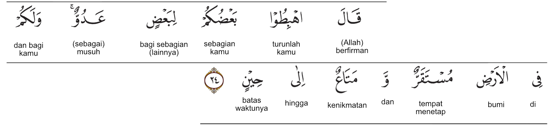 Kemenag RI 2019:Dia (Allah) berfirman, “Turunlah kamu! Sebagian kamu menjadi musuh bagi yang lain serta bagi kamu ada tempat tinggal dan kesenangan di bumi sampai waktu yang telah ditentukan.” Prof. Quraish Shihab:Dia berfirman: “Turunlah kamu! Sebagian kamu menjadi musuh bagi sebagian yang lain, dan bagi kamu ada tempat kediaman (sementara) di bumi dan kesenangan hidup sampai waktu yang ditentukan.” Prof. HAMKA:Dia berfirman, “Turunlah kamu semua! Yang sebagian kamu dari yang sebagian adalah musuh dan untuk kamu di dalam bumi itu adalah tempat menetap dan untuk bekal, sampai suatu ketika.”