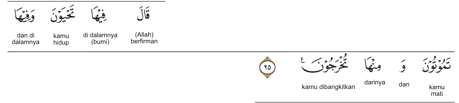 Kata wa fiha (وَفِيهَا) artinya: dan di dalamnya, maksudnya di bumi yang sama itu juga. Kata tamutun (تَمُوتُونَ) artinya: kalian mati.
