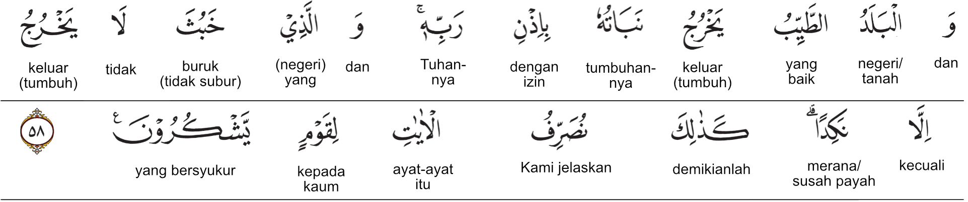 Maka ayat ke-58 melanjutkan gambaran itu dengan menjelaskan hasil yang berbeda dari hujan yang sama. Hujannya satu, tetapi tanahnya berbeda. Tanah yang baik menumbuhkan tanaman dengan subur, tanah yang buruk hanya menghasilkan tanaman yang merana atau tidak bermanfaat.
