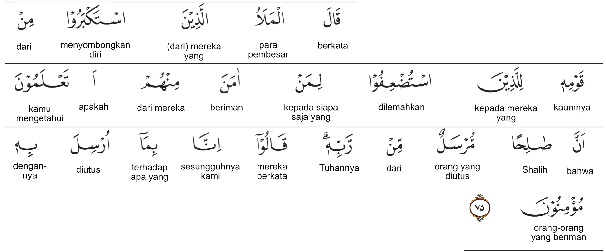 Prof. Quraish Shihab: Para pemuka dari kaumnya yang sangat sombong berkata kepada orang- orang yang dianggap lemah, yakni yang beriman di antara mereka: 'Apakah kamu mengetahui (percaya) bahwa Shaleh diutus oleh Tuhan Pemeliharanya?” Mereka menjawab: “Sesungguhnya kami beriman kepada apa (wahyu yang Nabi Shaleh as.) diutus untuk (menyampai kan) nya.”