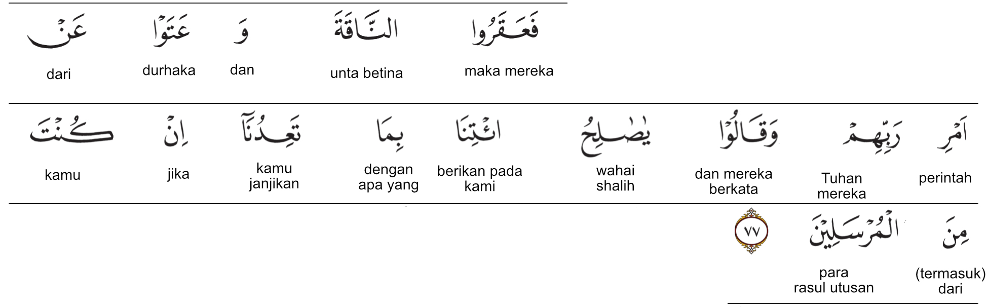 Kemenag RI 2019:Lalu, mereka memotong unta betina itu dan mereka melampaui batas terhadap perintah Tuhan mereka, dan mereka berkata, “Wahai Saleh, datangkanlah kepada kami apa (ancaman siksa) yang engkau janjikan kepada kami jika engkau termasuk orang-orang yang diutus (Allah).” Prof. Quraish Shihab:Kemudian, mereka menyembelih unta betina (itu) dan mereka melampaui batas terhadap perintah Tuhan Pemelihara mereka dan berkata: “Wahai Shaleh! Datangkanlah kepada kami apa (siksa) yang engkau janjikan kepada kami, jika engkau termasuk para rasul (yang diutus Allah swt.).” Prof. HAMKA:Maka mereka sembelihlah unta itu. Maka mendurhakalah mereka dari perintah Tuhan mereka, seraya mereka berkata, “Hai Shalih, datangkanlah kepada kami apa yang telah engkau janjikan kepada kami itu, jika benar engkau dari orang yang diutus.”
