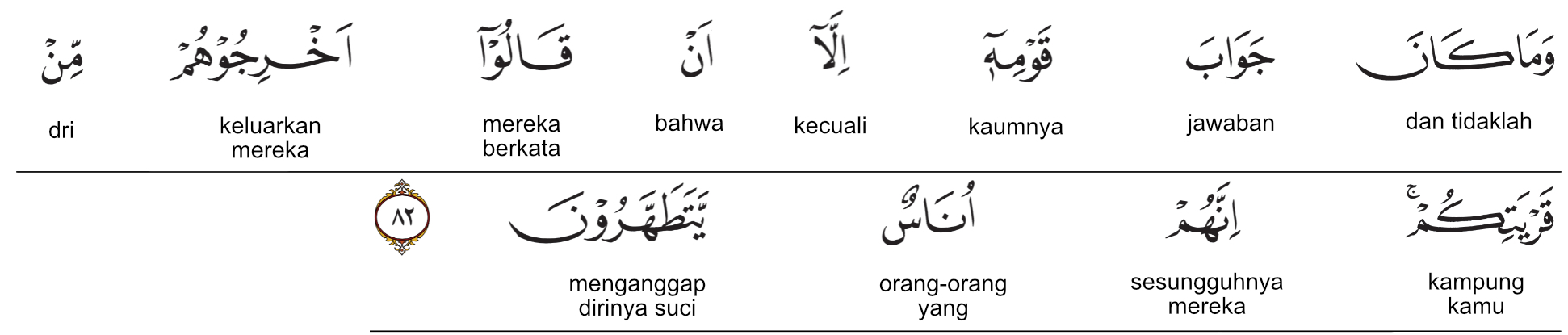 Kemenag RI 2019:Tidak ada jawaban kaumnya selain berkata, “Usirlah mereka (Lut dan pengikutnya) dari negerimu ini. Sesungguhnya mereka adalah orang-orang yang menganggap dirinya suci.” Prof. Quraish Shihab:Tidak ada jawaban kaumnya selain mengatakan: “Usirlah mereka (Nabi Luth as.) dari kota kamu, sesungguhnya mereka adalah orang-orang (lemah) yang (terus-menerus) sangat menyucikan diri.” Prof. HAMKA:Dan, tiadalah ada jawab kaumnya melainkan bahwa mereka berkata, “Keluarkanlah mereka itu dari desa-desa kamu. Sesungguhnya mereka itu adalah orang-orang yang ingin suci.”