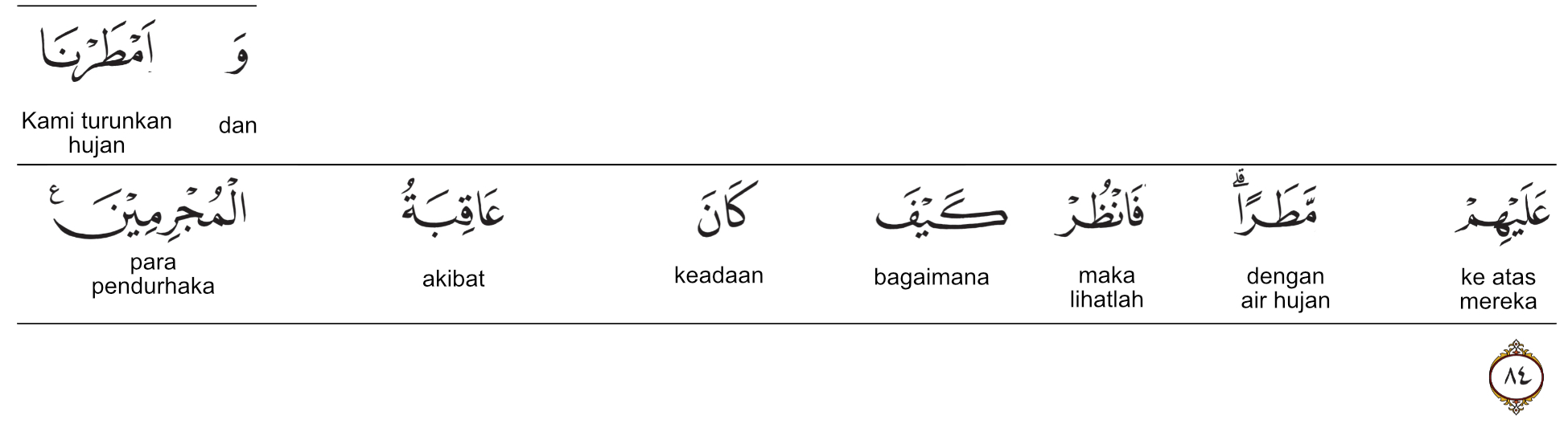 Dan Kami turunkan kepada mereka suatu hujan. Maka perhatikanlah bagaimana kesudahan orang-orang yang berbuat kejahatan.