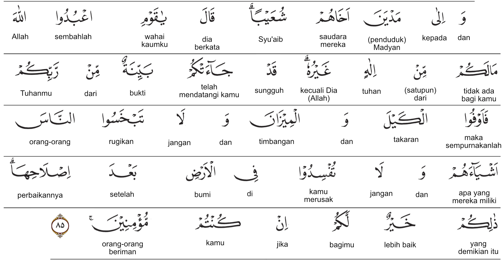 Kemenag RI 2019: Kepada penduduk Madyan, Kami (utus) saudara mereka, Syu?aib. Dia berkata, “Wahai kaumku, sembahlah Allah. Tidak ada bagimu tuhan (yang disembah) selain Dia. Sungguh, telah datang kepadamu bukti yang nyata dari Tuhanmu. Maka, sempurnakanlah takaran dan timbangan, dan janganlah merugikan (hak-hak) orang lain sedikit pun. Jangan (pula) berbuat kerusakan di bumi setelah perbaikannya. ) Itulah lebih baik bagimu, jika kamu beriman.”| TAFSIR AL-MAHFUZH | REFERENSI KITAB TAFSIR |