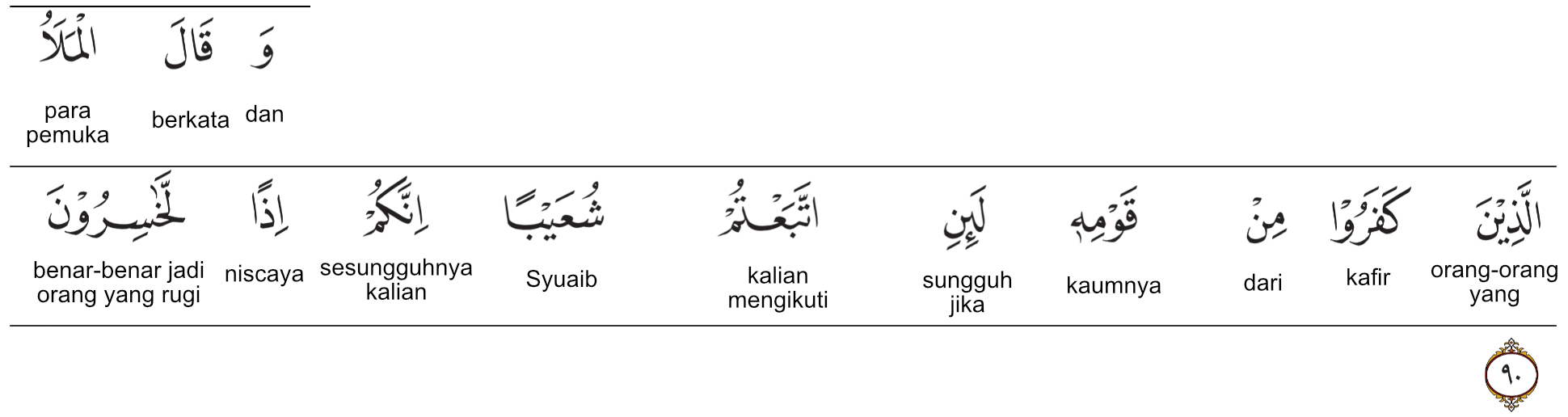 Kemenag RI 2019:Para pemuka orang-orang yang kufur dari kaumnya berkata (kepada sesamanya), “Sungguh, jika kamu mengikuti Syu?aib, niscaya kamu benar-benar menjadi orang-orang yang rugi.” Prof. Quraish Shihab:Dan para pemuka orang-orang yang kafir dari kaumnya berkata: “Jika kamu benar-benar mengikuti Syuaib sesungguhnya kamu—jika demikian—menjadi orang-orang yang rugi.” Prof. HAMKA:Dan berkata pemuka-pemuka yang kufur dari kaumnya itu, “Jika kamu mengikuti Syu’aib sesungguhnya kamu itu adalah orang-orang yang rugi.”