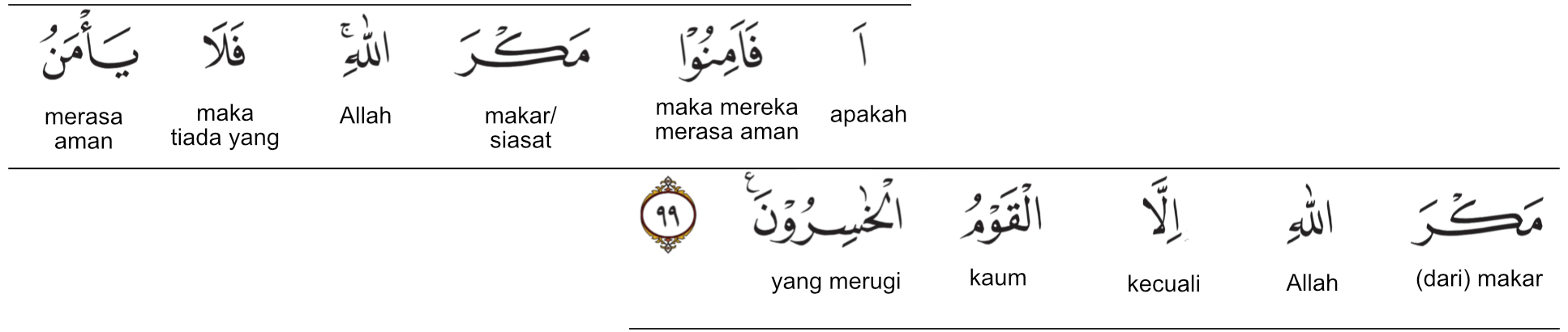 Ayat ke-99 dari surat Al-A’raf ini lebih tegas dari rangkaian peringatan sebelumnya yang menjelaskan bahwa azab bisa datang di malam hari saat manusia tidur dan di siang hari saat mereka sibuk bermain. Ayat ini mengangkat persoalan yang lebih mendasar yaitu rasa aman itu sendiri. Apakah manusia benar-benar pantas merasa aman dari ketentuan Allah?