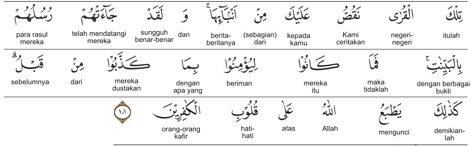 Kemenag RI 2019 : Negeri-negeri (yang telah Kami binasakan) itu Kami ceritakan sebagian kisahnya kepadamu (Nabi Muhammad). Sungguh, rasul-rasul mereka telah datang dengan membawa bukti-bukti yang nyata kepada mereka. Akan tetapi, mereka tidak mau beriman pada apa yang telah mereka dustakan sebelumnya. Demikianlah Allah mengunci hati orang-orang yang kafir.